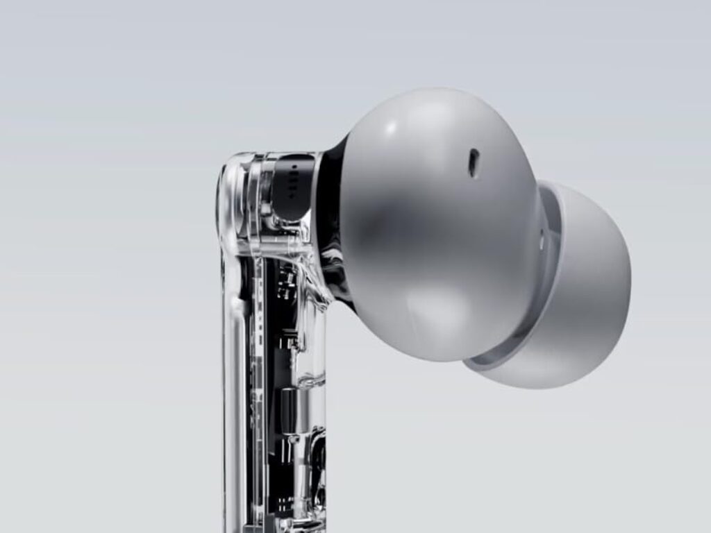 Los auriculares mantienen esa característica carcasa transparente al 89% que permite ver parte de la compleja estructura interna. Es fascinante observar los componentes, circuitos y drivers a través del material translúcido. Los pequeños detalles, como los círculos de colores rojo y blanco que indican qué auricular es el derecho y cuál el izquierdo, demuestran la atención al detalle de Nothing.