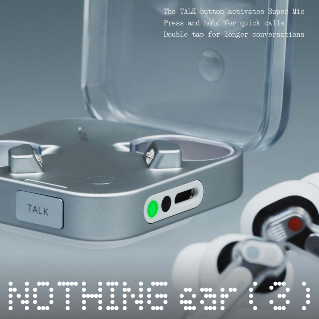 La principal novedad de esta generación es la integración del Super Mic directamente en el estuche de carga, una innovación que permite realizar llamadas y grabaciones de voz sin necesidad de sacar los auriculares. Además, incorporan por primera vez elementos metálicos en su construcción, manteniendo la transparencia característica de la marca pero añadiendo un toque premium que se nota tanto a la vista como al tacto.
