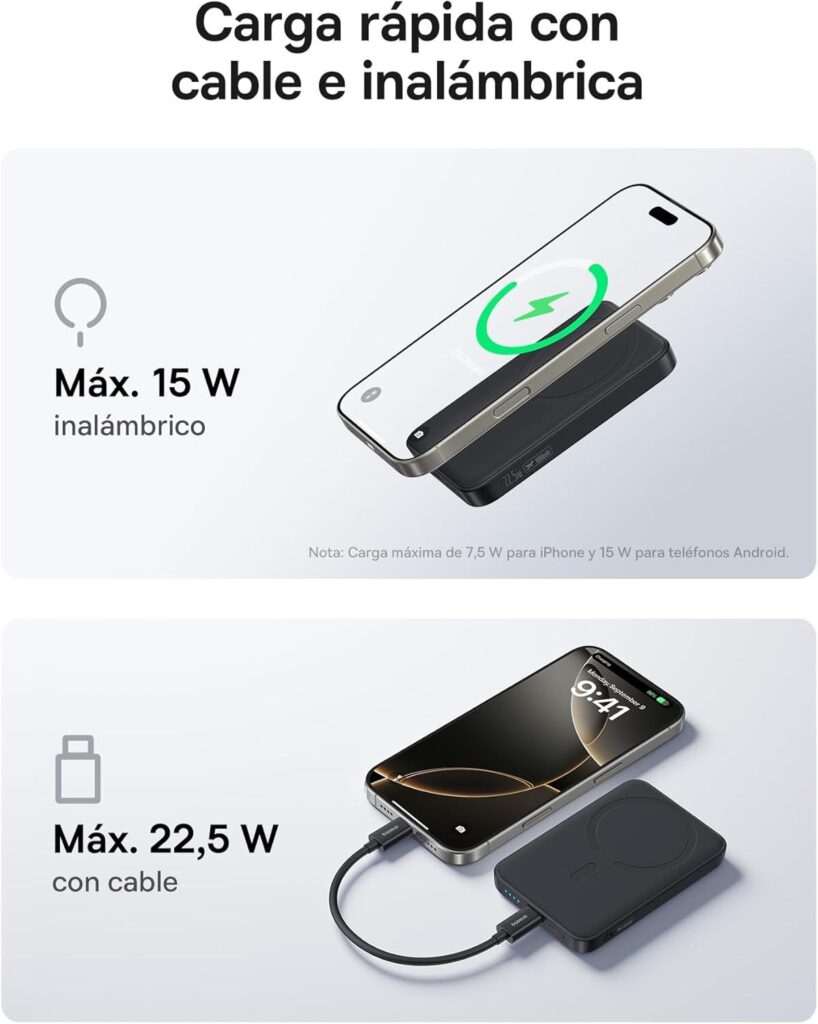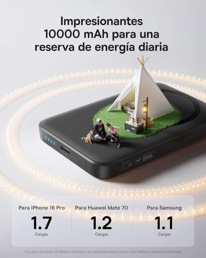 Con sus 10.000 mAh de capacidad, soporte magnético integrado y carga inalámbrica de 15W, este modelo se posiciona como una de las alternativas más completas del momento. Su diseño compacto hace que puedas llevarlo en el bolsillo sin que resulte molesto, y la compatibilidad Qi2 asegura una experiencia de carga más rápida y estable en móviles actuales.