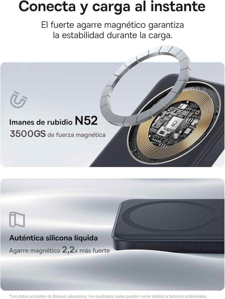 Los imanes de neodimio proporcionan una sujeción sorprendentemente segura. Hemos probado el dispositivo con un iPhone 15 Pro Max (el más pesado de la gama) en diferentes situaciones: caminando, en transporte público, incluso con ligeros movimientos bruscos, y el power bank se mantiene perfectamente adherido sin deslizarse.