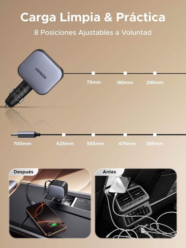 ¿Estás cansado de los cables enredados en tu coche? El cargador de coche retráctil UGREEN 145W Nexode representa la evolución definitiva en sistemas de carga vehicular, combinando potencia extrema, diseño innovador y la comodidad de un cable retráctil que elimina para siempre el caos de cables en tu vehículo.